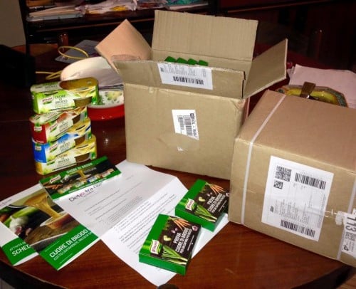 I pacchi omaggio ricevuti in queste ore dalle tester Knorr, contengono 30 campioni omaggio dell’insaporitore “Cuore di Brodo Knorr” (da distribuire ad amici e parenti), 4 confezioni formato vendita di Cuore di Brodo Knorr (in vari sapori) ed un blocchetto pieno di buoni sconto Knorr da staccare e regalare agli amici ed ai parenti!