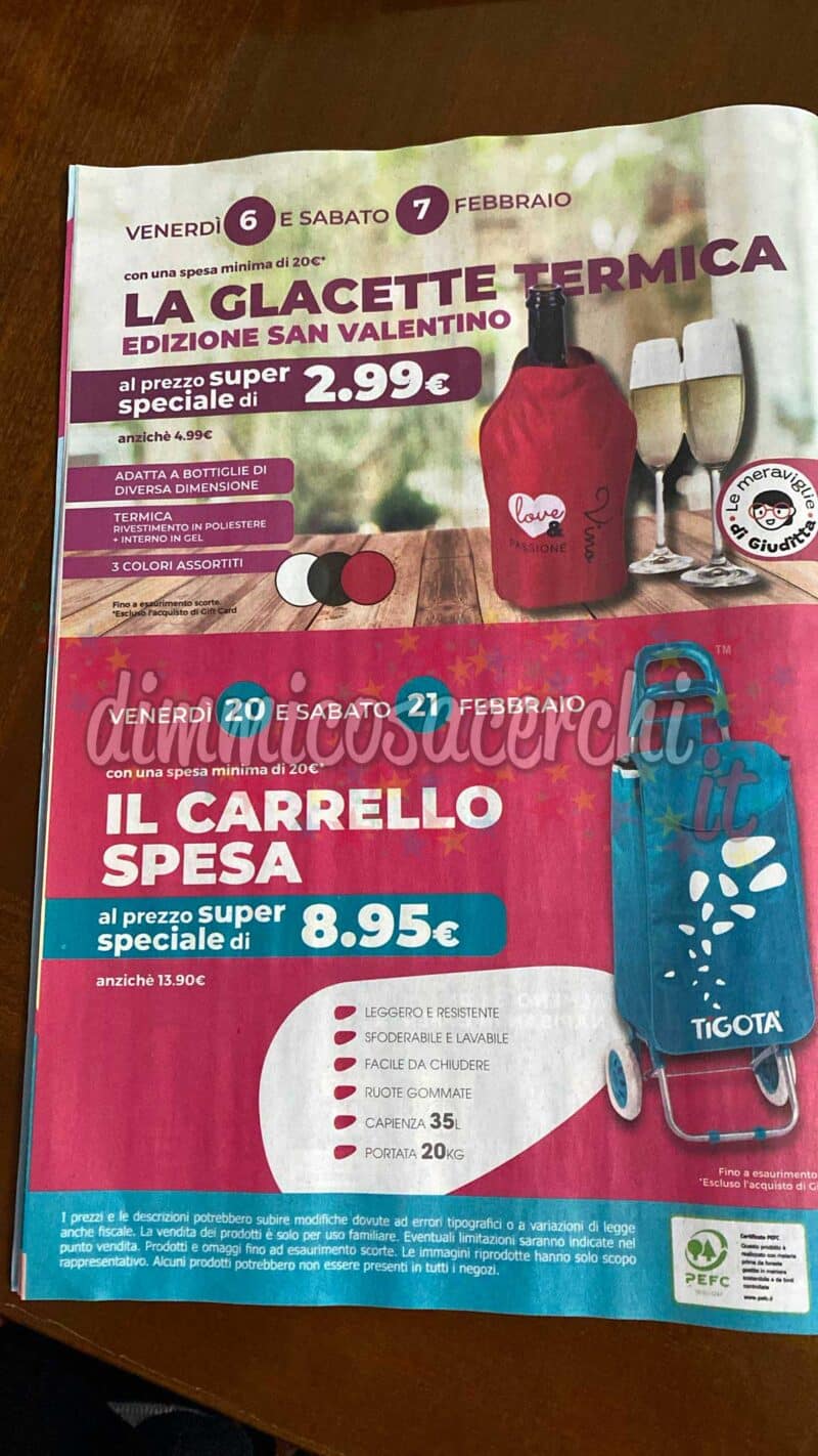 Infine, ecco altre due interessanti promozioni. In occasione di San Valentino, solo nelle giornate di venerdì 6 e sabato 7 febbraio 2026, con una spesa minima di 20 € potrai acquistare la Glacette Termica edizione San Valentino al prezzo speciale di soli 2,99 €. Si tratta di una speciale sacca termica che si adatta a bottiglie di diverse dimensioni, ed è disponibile tra i colori assortiti.